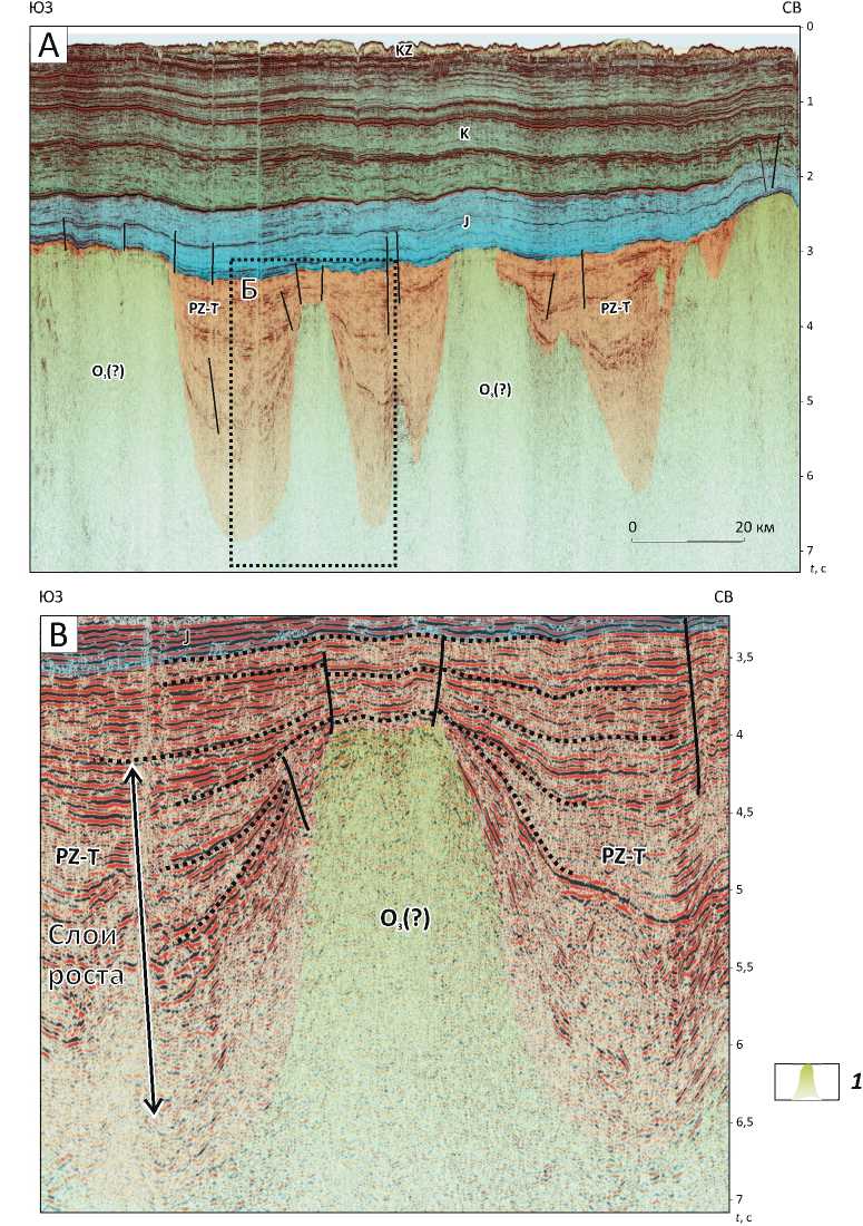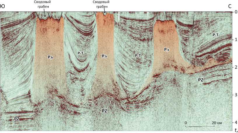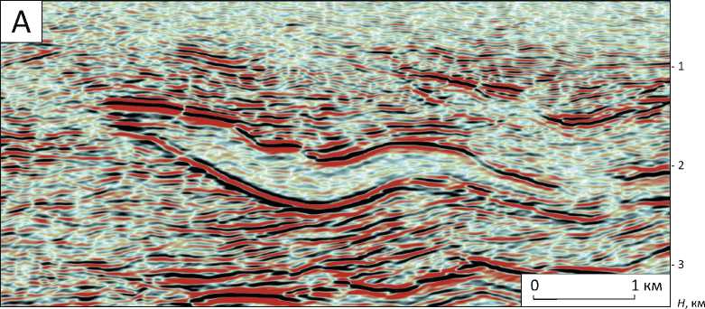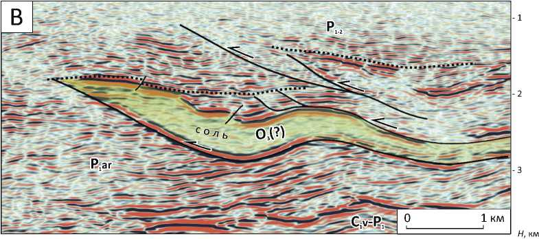 зионной складчатостью. Над поднятиями развиты радиальные системы разломов, характерные для районов соляной тектоники [19, 21]. Между поднятиями расположены глубокие прогибы-мульды. В зонах прилегания к поднятиям прослеживаются угловые несогласия и происходит резкое искривление слоев, их выклинивание и задирание вверх (см. рис. 9 B). Подобный характер слоистости в мульдах является важнейшим свидетельством их соляного происхождения. В зонах соляной тектоники эти деформации рассматриваются в качестве галокине-тических последовательностей, которые фиксируют динамику роста соляных диапиров [19, 21]. Они выделяются в широком глубинном и стратиграфическом диапазонах, указывая на продолжительный рост соляных поднятий. Высокая контрастность структурного плана в доюрских отложениях отражает перераспределение масс мобильных солей