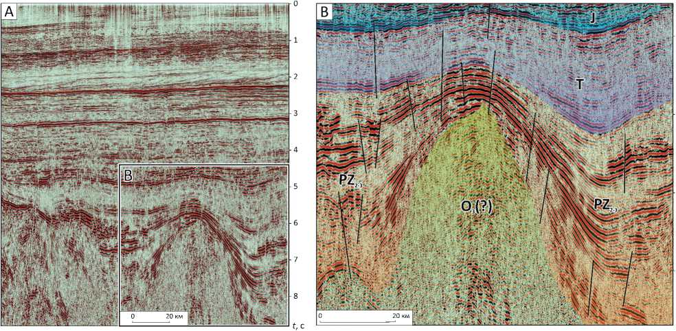 A — deep seismic section. B — the same section with geological interpretation
