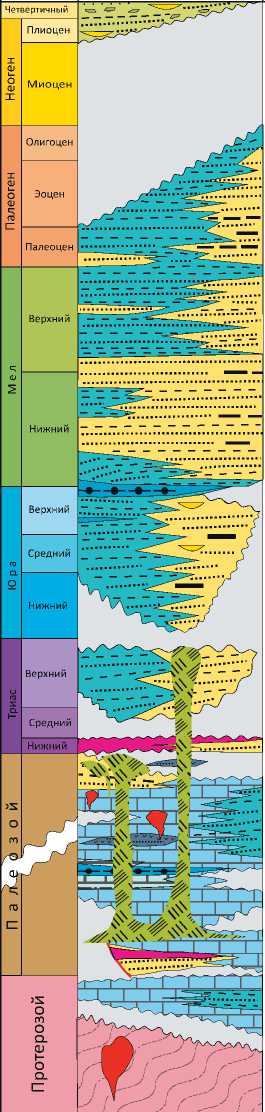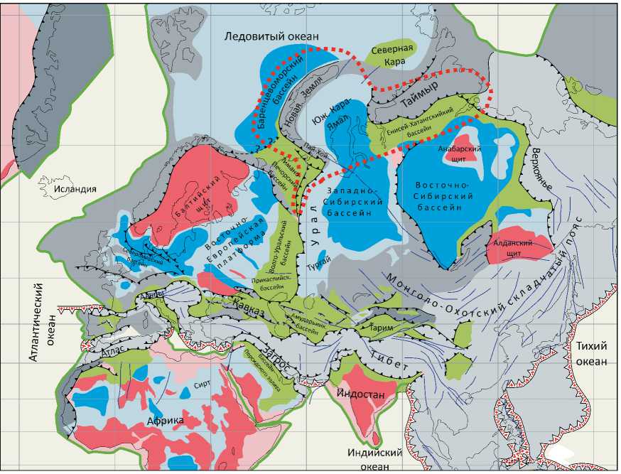 Начиная с юрского времени в пределах арктических бассейнов Западной Евразии произошла обширная трансгрессия. Она охватила Западную Сибирь, Енисей-Хатангский и Баренцевоморский прогибы, превратив их в мелководные эпиплат-форменные бассейны. В этих бассейнах накопились юрско-меловые отложения, представленные преимущественно мелководными и прибрежными песчано-глинистыми образованиями, включающими угленосные толщи. Поступление обломочного материала происходило в результате эрозии прилегающих складчатых сооружений и Сибирской плат- формы. В раннем мелу складчатость в Верхоянье способствовала оживлению эрозии на Сибирской платформе. Это привело к формированию толщ клиноформного строения, широко развитых в пределах Западно-Сибирского и Енисей-Хатангского бассейнов. В палеогене – неогене Северная Евразия испытывала преимущественно восходящие движения. В конце четвертичного времени регион подвергся оледенению. Последующее удаление ледникового покрова привело к поднятию и изменениям состояния флюидальных систем этих бассейнов.