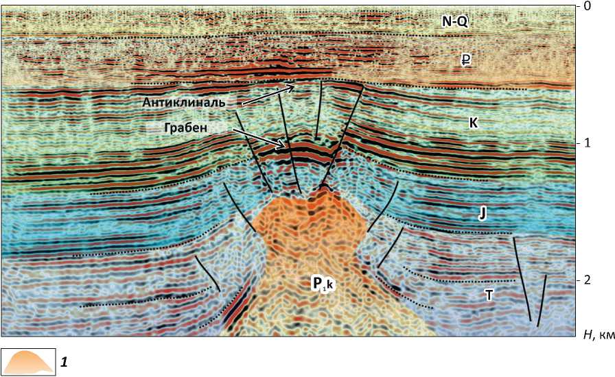 стью [17, 18]. Это в полной мере отвечает условиям структурного развития на севере Западно-Сибирского бассейна. Наглядным примером реальности данного механизма деформаций может служить сейсмический разрез Халганского газового месторождения в Калмыкии (рис. 13).
