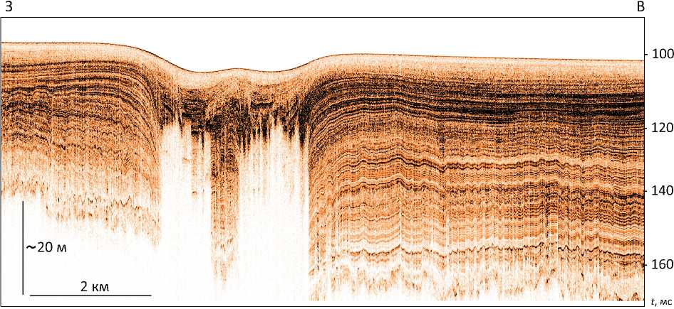 Рис. 15. Сейсмоакустический малоглубинный разрез зоны предполагаемого коллапса соляного штока, Баренцевоморский бассейн (из [25])