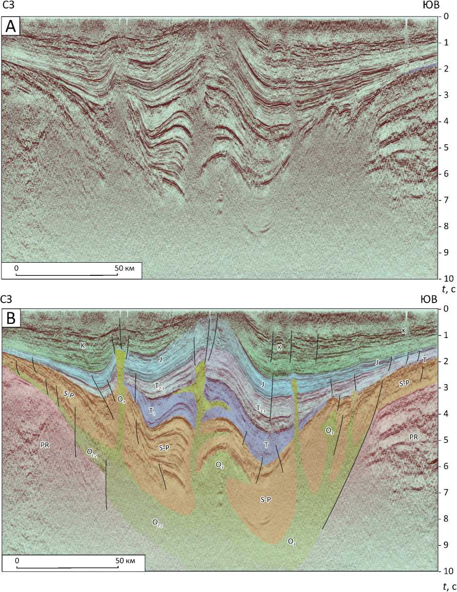 А — сейсмический временной разрез, B — тот же разрез с интерпретацией. Положение разреза см. на рис. 4.