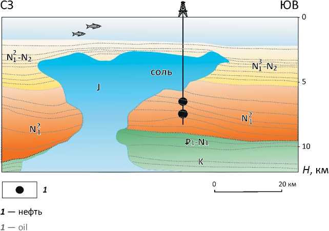 1 — fault, 2 — well, 3 — deformed salt; 4 — reef.