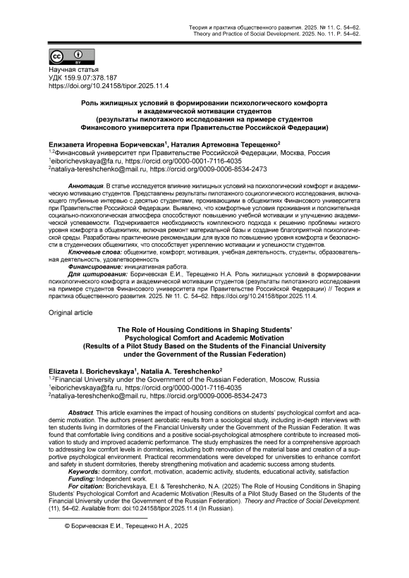 В статье исследуется влияние жилищных условий на психологический комфорт и академическую мотивацию студентов. Представлены результаты пилотажного социологического исследования, включающего глубинные интервью с десятью студентами, проживающими в общежитиях Финансового университета при Правительстве Российской Федерации. Выявлено, что комфортные условия проживания и положительная социально-психологическая атмосфера способствуют повышению учебной мотивации и улучшению академической успеваемости. Подчеркивается необходимость комплексного подхода к решению проблемы низкого уровня комфорта в общежитиях, включая ремонт материальной базы и создание благоприятной психологической среды. Разработаны практические рекомендации для вузов по повышению уровня комфорта и безопасности в студенческих общежитиях, что способствует укреплению мотивации и успешности студентов.