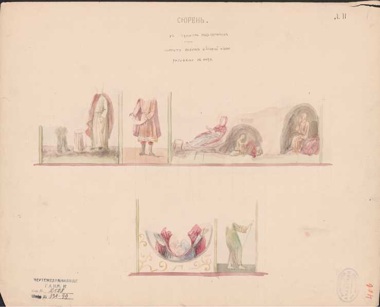 Лист размерами 350 х 400 мм выполнен акварелью в цвете. Здесь помещены четыре фрагмента стенописи. Авторское заглавие: «Сюрень. Над окнами».
