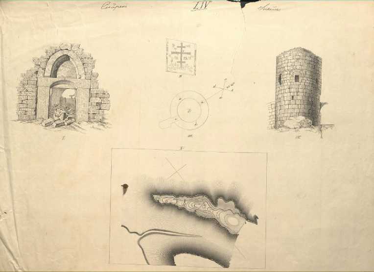 На первом листе (Таб. LIII) (рис. 1) представлен общий вид сюйреньских укреплений (башни и части оборонительной стены) с внутренней стороны крепости, выполненный в технике печатной графики – хромолитографии. Второй лист (Таб. LXIV) (рис. 2), выполнен в технике гравюры. Он содержит несколько черно-белых изображений: крепостные во- рота, план и вид башни с внешней стороны крепости, рисунок Хризмы, имевшийся в замке одного из окон, план мыса Куле-Бурун.