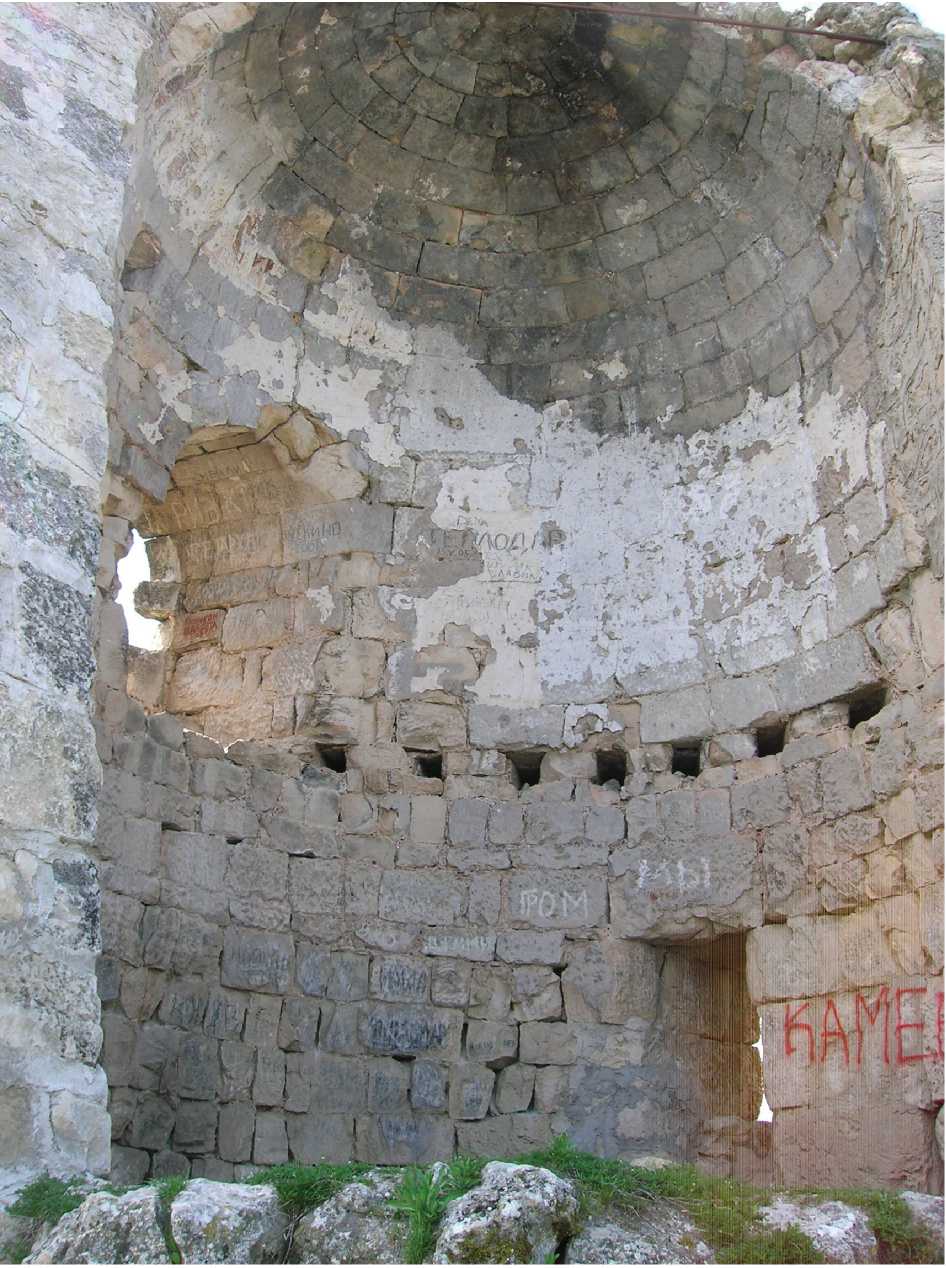 Введение. Сюйреньская крепость площадью 1,7 га, находится на окруженной скальными обрывами оконечности мыса Ку-ле-Бурун (Башенный мыс) (Горный Юго-Западный Крым). Самым известным памятником Сюйреньской крепости является ее оборонительная линия, состоящая из двух куртин, соединяющихся под тупым углом и круглой баши между ними (рис. 1, 2). Двухэтажная башня диаметром 8 м достигала высоты 10 м. Она была сложена из обработанных известняковых блоков в перевязь со стеной. С ее восточной стороны были устроены сводчатые ворота, шириной 3,2 м, а с западной калитка. Межэтажные перекрытия были деревянными. В нижнем этаже башни находились бойницы, а на втором, в XIII–XV вв. была устроена церковь, стены и купол которой были полностью покрыты фресковой росписью (см., например: [8, с. 178–187]). В настоящее время купол верхнего этажа разрушен, а фрески практически полностью уничтожены (рис. 3).