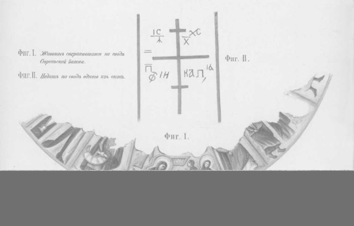 Рисунок стенописи черно-белый и передает сохранившиеся на момент обследования фрагменты стенописи. Верхнее изображение – Хризма, обозначена автором как «Надпись на своде одного из окон». Рисунок ниже отображает фрагменты стенописи верхнего регистра башни и носит наименование «Живопись, сохранившаяся на своде Сюйреньской башни». Первые два фрагмента – изображения пророков, далее показана композиция Рождества Христова. Затем следуют еще три композиции, которые по указанному изображению сложно атрибутировать.