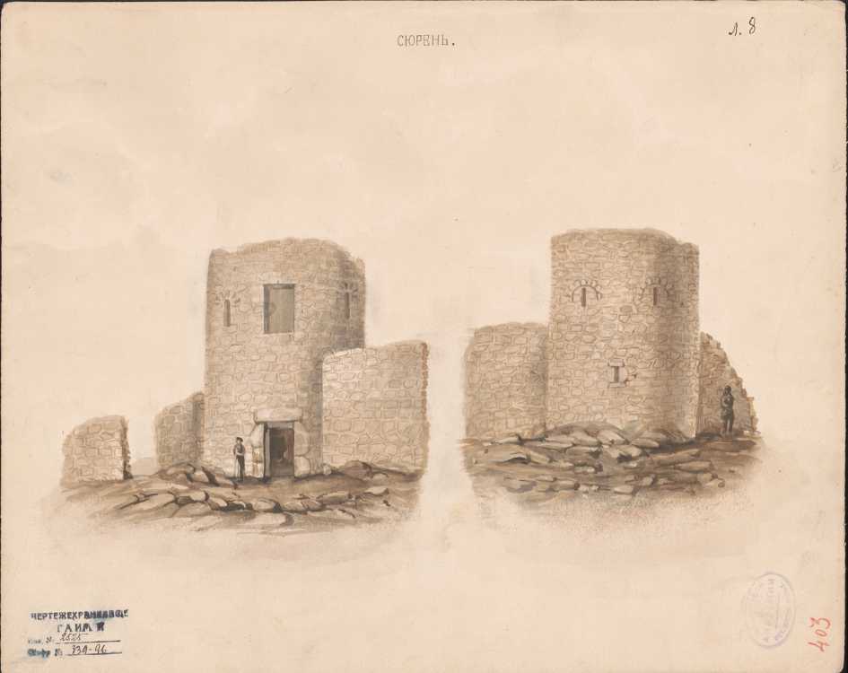 В Научном архиве Института истории материальной культуры РАН (ИИМК РАН) сохранился отчет Д.М. Струкова о посещении (вероятнее всего, во время третьей поездки) Сюйрени: «Дальше за 12 верст отправился в Сюрень, где на необитаемой высокой скале стоят остатки древней крепости и башни См. рис. 8 и 9. Способом кладки по моему мнению одновременной с древними башнями, находящимися на Кавказе в Абхазии, которая относится к концу V века, башня круглой формы. При входе направо лестница в стене ведшая во второй этаж, в настоящее время, пола, разделяющего оба этажа нет, но признаки существования пола есть, во втором этаже помещался храм, от коего сохранились остатки фресковой живописи из чего более (сохранились) над окном изображение креста с греческими буквами [IC XC HI KA] См рис. 10 и над корнизом остатки образа Знамения Рождества Христова древней редакции, что мною нарисовано См. рис 10 ...Св. Пахомия явление ангела рис. 11, Царь Давид, Прор. Исайя» [3, л. 23]. Как видим, представленное описание стенописи достаточно краткое. Однако в том же архиве сохранились и указанные Д.М. Струковым детально исполненные акварельные листы, которые представляют несомненный интерес.
