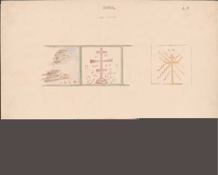 Лист размерами 350 х 400 мм озаглавлен автором «Сюрень. В куполе под карнизом покрыто слоем вековой пыли, рисовано с низу». Изображения расположены в горизонтальном формате и представляют собой небольшие акварельные этюды. Размер каждого 5–8 см.