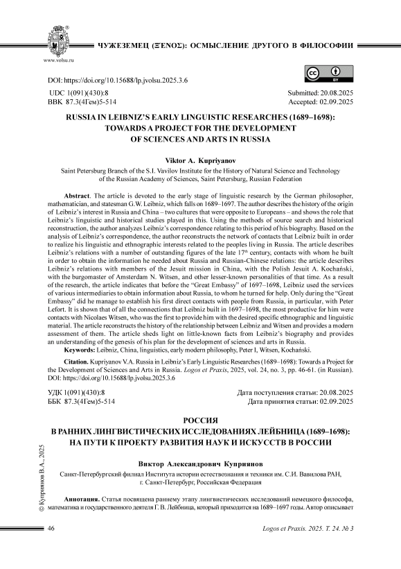 Статья посвящена раннему этапу лингвистических исследований немецкого философа, математика и государственного деятеля Г. В. Лейбница, который приходится на 1689–1697 годы. Автор описывает историю зарождения интереса Лейбница к России и к Китаю – двум противоположным для европейцев культурам – и показывает, какую роль в этом сыграли лингвистические и исторические занятия Лейбница. Используя методы источникового поиска и исторической реконструкции, автор анализирует переписку, относящуюся к данному периоду его биографии. Благодаря выполненному анализу автор реконструирует сеть контактов, которую философ выстроил в целях реализации своих лингвистических и этнографических интересов, связанных с народами, проживавшими на территории России. Описан обмен письмами Лейбница с рядом выдающихся деятелей конца XVII в., контакты с которыми он завязал для получения необходимой ему информации о России и российско-китайских отношениях: в статье приводится описание отношений с членами иезуитской миссии в Китае, с польским иезуитом А. Коханским, с бургомистром Амстердама Н. Витсеном и другими менее известными персоналиями того времени. В результате исследования в статье указывается, что до «Великого посльства» 1697–1698 гг. для получения информации о России Лейбниц пользовался услугами разнообразных посредников, к которым обращался за помощью. Лишь в период «Великого посольства» ему удалось установить первые прямые контакты с выходцами из России, в частности с Петром Лефортом. Показано, что в рассматриваемый период из всех связей наиболее продуктивной для него оказалась переписка с Николаем Витсеном, который впервые смог предоставить ему желаемый конкретный этнографический и лингвистический материал. В статье реконструируется история отношений Лейбница и Витсена, приводится их современная оценка. Статья проливает свет на малоизвестные факты биографии философа и дает понимание генезиса его плана развития наук и искусств в России.