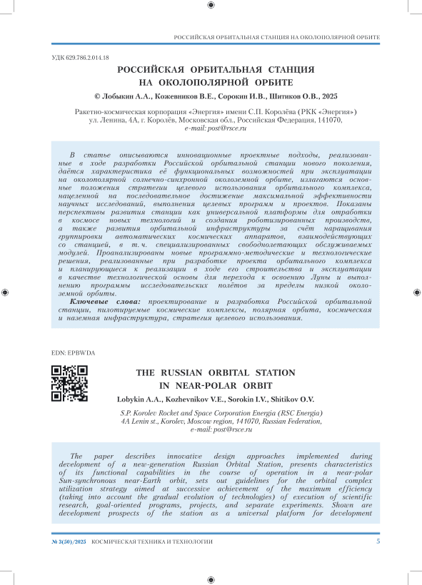 Проектирование и разработка Российской орбитальной станции, пилотируемые космические комплексы, полярная орбита, космическая и наземная инфраструктура, стратегия целевого использования