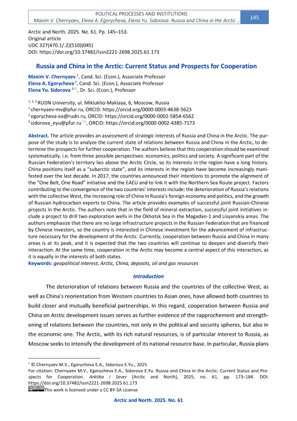 The article provides an assessment of strategic interests of Russia and China in the Arctic. The purpose of the study is to analyze the current state of relations between Russia and China in the Arctic, to determine the prospects for further cooperation. The authors believe that this cooperation should be examined systematically, i.e. from three possible perspectives: economics, politics and society. A significant part of the Russian Federation's territory lies above the Arctic Circle, so its interests in the region have a long history. China positions itself as a “subarctic state”, and its interests in the region have become increasingly manifested over the last decade. In 2017, the countries announced their intentions to promote the alignment of the “One Belt, One Road” initiative and the EAEU and to link it with the Northern Sea Route project. Factors contributing to the convergence of the two countries’ interests include: the deterioration of Russia’s relations with the collective West, the increasing role of China in Russia’s foreign economy and politics, and the growth of Russian hydrocarbon exports to China. The article provides examples of successful joint Russian-Chinese projects in the Arctic. The authors note that in the field of mineral extraction, successful joint initiatives include a project to drill two exploration wells in the Okhotsk Sea in the Magadan-1 and Lisyanskiy areas. The authors emphasize that there are no large infrastructure projects in the Russian Federation that are financed by Chinese investors, so the country is interested in Chinese investment for the advancement of infrastructure necessary for the development of the Arctic. Currently, cooperation between Russia and China in many areas is at its peak, and it is expected that the two countries will continue to deepen and diversify their interaction. At the same time, cooperation in the Arctic may become a central aspect of this interaction, as it is equally in the interests of both states.
