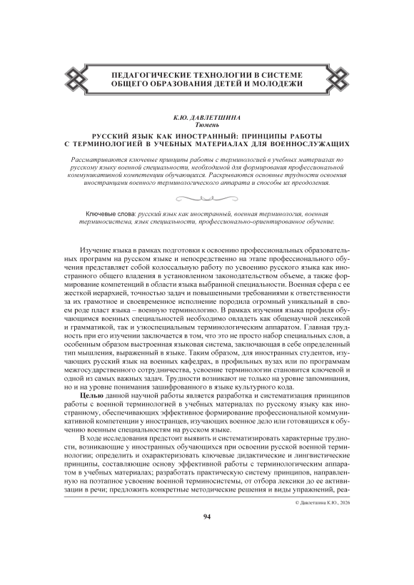 Русский язык как иностранный: принципы работы с терминологией в учебных материалах для военнослужащих