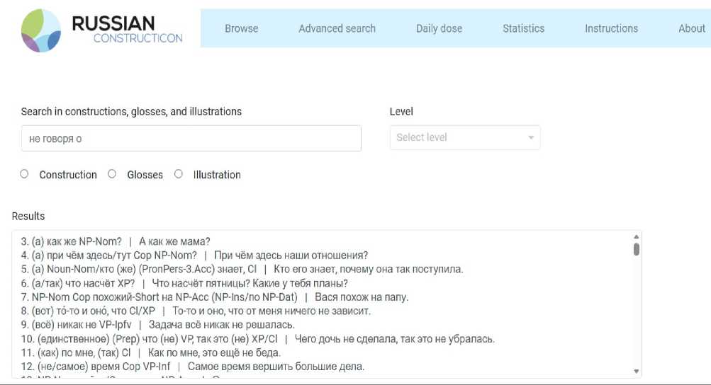 Для эффективного начала работы с ресурсом начинающему пользователю рекомендуется первым делом обратиться к разделу «Инструкция», а именно – к подразделу «Сокращения и символы». Это позволит быстро освоить систему условных обозначений (таких как NP, VP, Gen, Pfv и т. д.), которая используется для формального описания конструкций. Понимание этой системы является ключом к корректному чтению профилей конструкций и использованию поисковых фильтров. После ознакомления с обозначениями можно приступать к просмотру каталога и выполнению поиска (рис. 4).