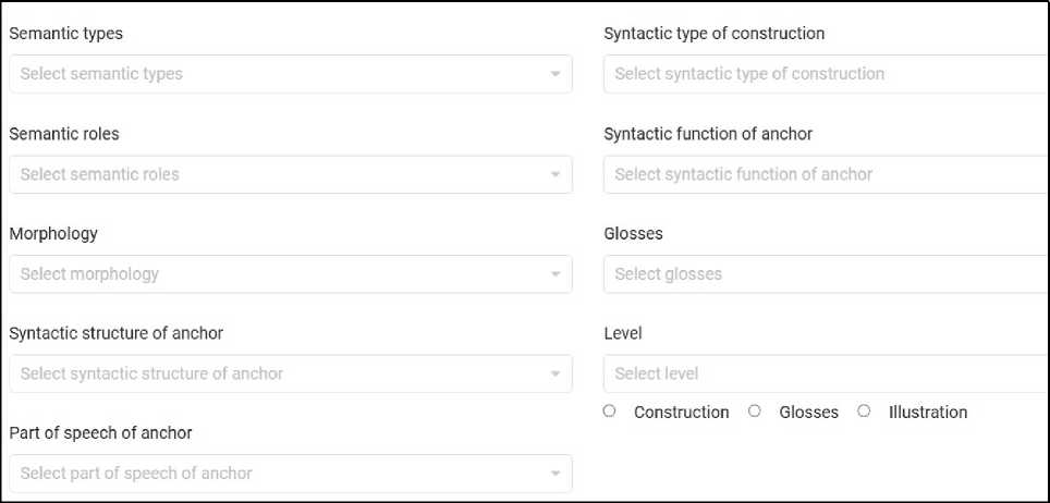 Для удобства навигации слева расположена поисковая строка. В неё можно ввести любую последовательность символов для поиска по базе: конкретное слово или словоформу; обозначение грамматических категорий (например, NP, Dat, Pfv); часть формального шаблона конструкции. Также существует возможность фильтрации по уровню сложности (CEFR), что особенно полезно для изучающих язык.