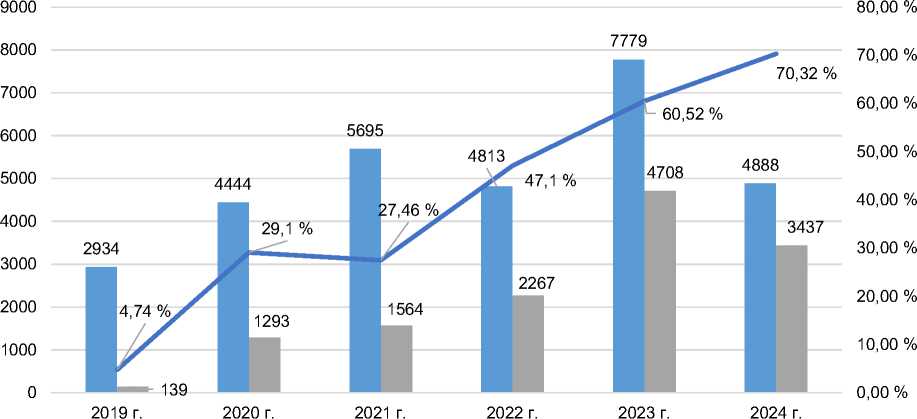 Объем ипотечного кредитования на индивидуальное жилье за исследуемый период, а также количество выданных кредитов, напротив, снижались. Так, по программе «Льготная ипотека» первый сократился с 1 021,6 млрд руб. в 2020 г., до 761,7 млрд руб. в 2024 г.; второе уменьшилось с 348,2 тыс. единиц в 2020 г., до 178,5 тыс. единиц в 2024 г. Отсутствие высокого спроса на программу способствовало ее завершению в июле 2024 г.4