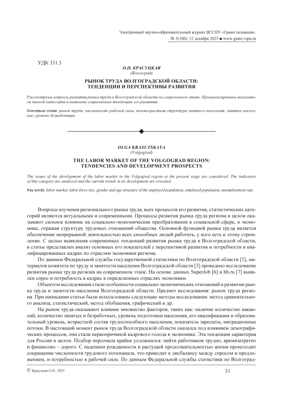 Таким образом, анализ данных позволил оценить состояние рынка труда региона и сделать следующие выводы: рынок труда Волгоградской области претерпевает заметные и быстрые изменения, тенденции которого заключаются в усилении кадрового дефицита, увеличении доли пожилых работников, росте числа вакансий с гибкой занятостью, увеличении спроса на специалистов в области информационных технологий и сферы продаж.