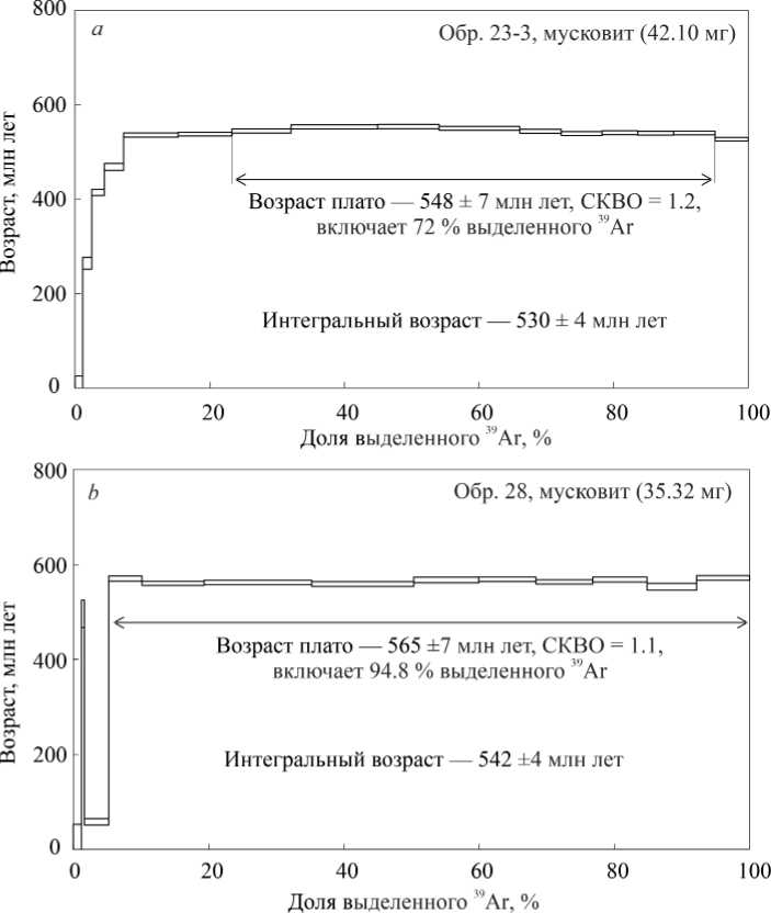 В возрастном 40Ar-39Ar-спектре мусковита из гранитов скв. 1-Южная Болотная (рис. 8, a) выделяется кондиционное плато, хорошо выраженное в средне- и высокотемпературной областях, которое отвечает средневзвешенному возрасту 548 ± 7 млн лет. По результа-