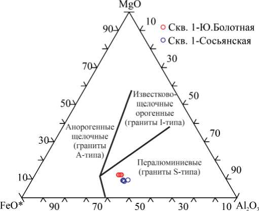 Двуслюдяные граниты, вскрытые скважинами 1-Сосьянская и 1-Южная Болотная в фундаменте Ижемской зоны Печорской синеклизы по минеральному и химическому составу наиболее близки к гра-нитоидам S-типа, образующимся за счет частичного плавления метаосадочного субстрата.