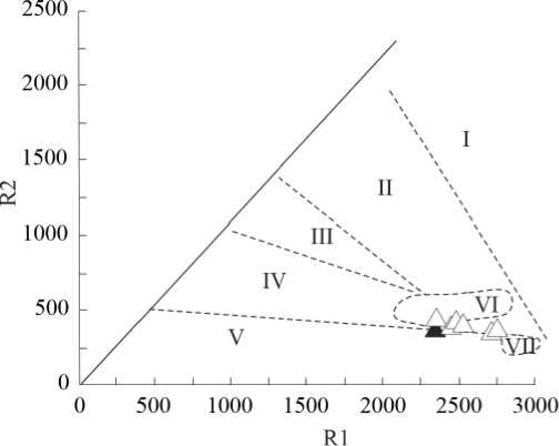 Рис. 11. Мультикатионная диаграмма R1–R2 (Batchelor, Bowden, 1985). Поля составов гранитоидов: I — дифферен-циатов мантийных магм, II — надсубдукционных, III — постколлизионных поднятий, IV — позднеорогенных, V — анорогенных, VI — синколлизионных, VII — посторогенных. R1 = 4Si–11(Na+K)–2(Fe+Ti), R2 = 6Ca+2Mg+Al.