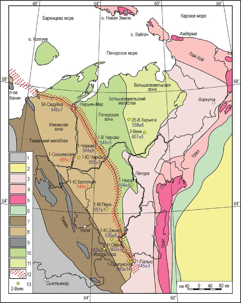 Fig. 1. Tectonic structure of the basement of the Pechora basin and its frame (according to Timan-Pechora..., 2000; Belyakova et al., 2008): 1 — East European Craton; 2 — West Siberian Plate; 3—6 — the Urals: 3 — Cis-Ural Foredeep, 4 — West Ural megazone, Paleozoic complexes of Pai-Khoi, Vaigach Island, and Novaya Zemlya Archipelago, 5 — Central Ural megazone, Upper Precambrian complexes of Pai-Khoi, Vaigach Island, and Novaya Zemlya Archipelago, 6 — East Ural megazone; 7—11 — basement of the Pechora plate: 7 — Timan; 8 — Izhma zone; 9 — exposures of the basement; 10 — Pechora zone; 11 — Bolshezemelskaya zone; 12 — Pripechora fault zone (northwestern part — Charkayu-Pylemets fault, southeastern part — Ilych-Chikshino fault); 13 — boreholes. The ages of granitoids is highlighted in color: blue — zircon ages (U-Pb, SIMS), red — muscovite ages (40Ar/39Ar)