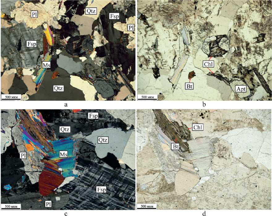 Рис. 2. Микрофотографии шлифов из гранитов скважин 1-Южная Болотная (a, b) и 1-Сосьянская (c, d) с анализатором (a, c) и без анализатора (b, d). Qtz — кварц, Pl — плагиоклаз, Fsp — калиевый полевой шпат, Bt — биотит, Ms — мусковит, Apt — апатит, Chl — хлорит