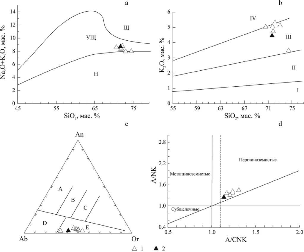 По петрохимической классификации породы относятся к семействам гранитов и умеренно-щелочных гранитов, на диаграмме Ab–An–Or точки их составов располагаются в поле гранитов (рис. 3, c).
