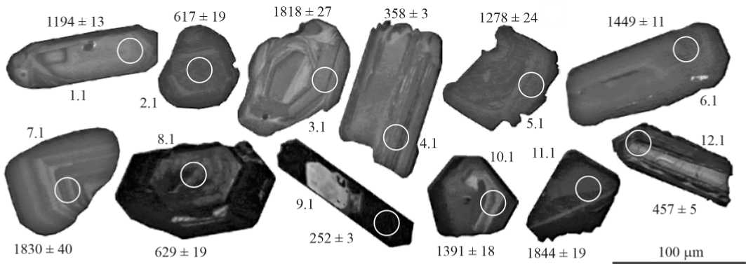 мегаблока, поскольку магматические объекты такого возраста не выявлены. Условно их появление может быть связано с тектономагматическими событиями, происходившими в это время на Среднем Тимане. Так, возраст, полученный в точке 9.1, сопоставим с K-Ar-возрастом ультракалиевых трахитов, составляющим 271–288 млн лет (Мальков, 1999), а в точке 4.1 — с K-Ar-возрастом девонских трахитов, равным 365 ± 8 млн лет (Шуйский и др., 2023). 206Pb/238U-возрасты, установленные в аналитических точках 2.1 и 8.1 (617 ± 19 и 629 ± 19 млн лет соответственно), немного древнее датировок цирконов из скв. 1-Нижняя Омра (602 ± 2 млн лет) и скв. 1-Прилукская (593 ± 14 млн лет), расположенных в юго-восточной части Ижемской зоны (рис. 1).