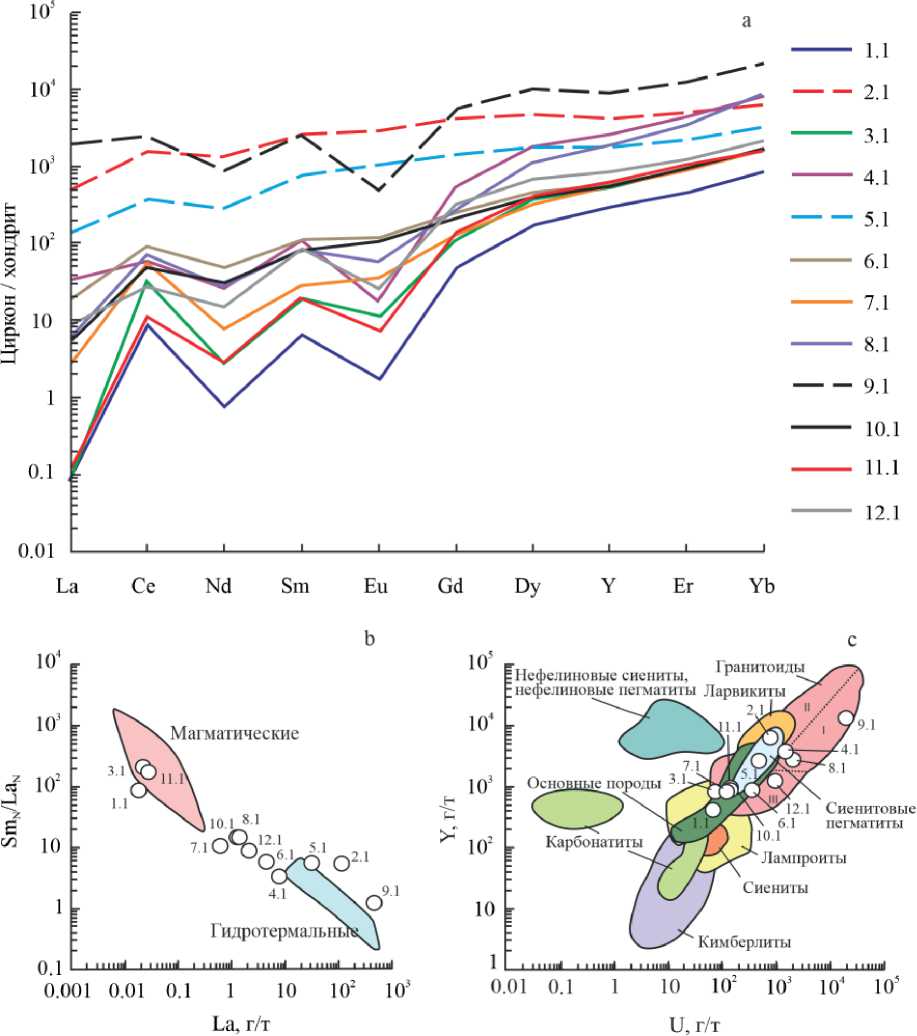 Fig. 6. Diagrams illustrating the compositional features of the studied zircon grains: a — chondrite-normalized (Sun, McDonough, 1989) REE chart; b — SmN/LaN — La (Hoskin, 2005); c — Y—U, the compositional field of zircon from granitoids includes zircon from aplites and leucogranites (I), granites (II), granodiorites and tonalites (III) (Belousova et al., 2002). Grain numbers correspond to the numbers in Tables 4 and 5