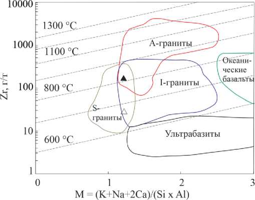 Исследованные граниты характеризуются повышенной щелочностью и глиноземистостью, обогащены K и P и обеднены Ti, Mg и Ca. Магмы, из которых кристаллизуются граниты подобного состава, возникают при частичном плавлении преимущественно ме-тапелитового субстрата (рис. 10, a). На диаграмме Дж. Маеды фигуративные точки состава гранитов из обеих скважин располагаются в поле гранитов S-типа (рис. 10, b), а на графике зависимости концентрации циркония в расплаве от состава и температуры магмы (рис. 7) попадают в области перекрытия полей составов гранитов: S- и I- типов (скв. 1-Южная Болотная), S-, I- и A-типов (скв. 1-Сосьянская).