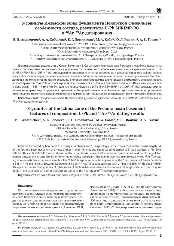 Граниты, вскрытые скважинами 1-Южная Болотная и 1-Сосьянская в Ижемской зоне Тиманского мегаблока фундамента Печорской синеклизы по особенностям минерального и химического состава наиболее близки к гранитам S-типа. U-Pb (SIMS SHRIMP-IIe и SHRIMP-RG)-исследование цирконов из этих гранитоидов не позволило корректно зафиксировать время образования пород, поскольку цирконы оказались либо унаследованными, либо высокодискордантными. 40Ar-39Ar-датирование мусковитов из тех же образцов, в которых анализировались цирконы, дало возможность скорректировать возраст гранитов. 40Ar-39Ar-возраст мусковита в гранитах скв. 1-Южная Болотная составил 548 ± 7 млн лет, а в скв. 1-Сосьянская — 565 ± 7 млн лет. Эти данные коррелируются с U-Pb (SIMS SHRIMP-IIe и SHRIMP-RG)-результатами по цирконам из гранитоидов других зон фундамента Печорской синеклизы и свидетельствуют о масштабном проявлении гранитоидного магматизма в позднем венде при коллизионных процессах на завершающей фазе тиманского тектогенеза.