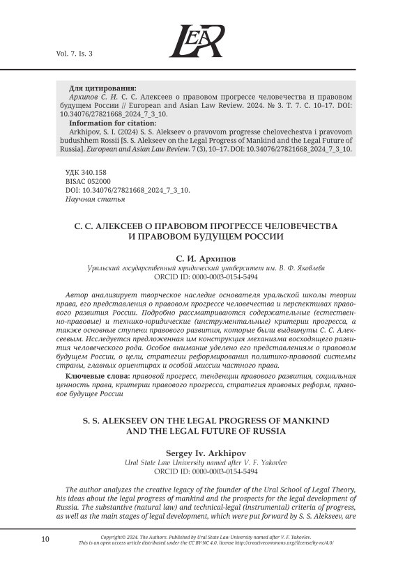Автор анализирует творческое наследие основателя уральской школы теории права, его представления о правовом прогрессе человечества и перспективах правового развития России. Подробно рассматриваются содержательные (естественно-правовые) и технико-юридические (инструментальные) критерии прогресса, а также основные ступени правового развития, которые были выдвинуты С. С. Алексеевым. Исследуется предложенная им конструкция механизма восходящего развития человеческого рода. Особое внимание уделено его представлениям о правовом будущем России, о цели, стратегии реформирования политико-правовой системы страны, главных ориентирах и особой миссии частного права.