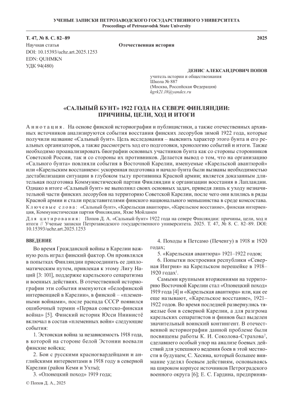 На основе финской историографии и публицистики, а также отечественных архивных источников анализируются события восстания финских лесорубов зимой 1922 года, которые получили название «Сальный бунт». Цель исследования – выяснить характер этого бунта и его реальных организаторов, а также рассмотреть ход его подготовки, хронологию событий и итоги. Также необходимо проанализировать биографии основных участников бунта как со стороны сторонников Советской России, так и со стороны их противников. Делается вывод о том, что на организацию «Сального бунта» повлияли события в Восточной Карелии, именуемые «Карельской авантюрой» или «Карельским восстанием»: ускоренная подготовка и начало бунта были вызваны необходимостью дестабилизации ситуации в глубоком тылу противника Красной армии; является доказанным длительная подготовка Коммунистической партии Финляндии к организации восстания в Лапландии. Однако в итоге «Сальный бунт» не выполнил своих основных задач, приведя лишь к уходу незначительной части финских лесорубов на территорию Советской Карелии, после чего они влились в ряды Красной армии и стали представителями финского национального меньшинства в среде комсостава.