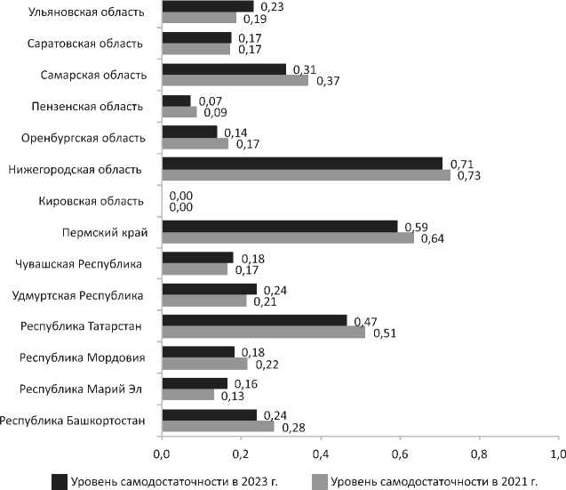 В соответствии с полученными данными в 2021 и 2023 годах наибольшие значения уровня самодостаточности демонстрировали Нижегородская область и Пермский край с результатами в 0,73 и 0,64, а также 0,71 и 0,59 соответственно. В тройку регионов-лидеров также вошла Республика Татарстан. Наименьшие значения уровня самодостаточности в 2021 и 2023 годах отмечались в Кировской и Пензенской областях (рис. 2).