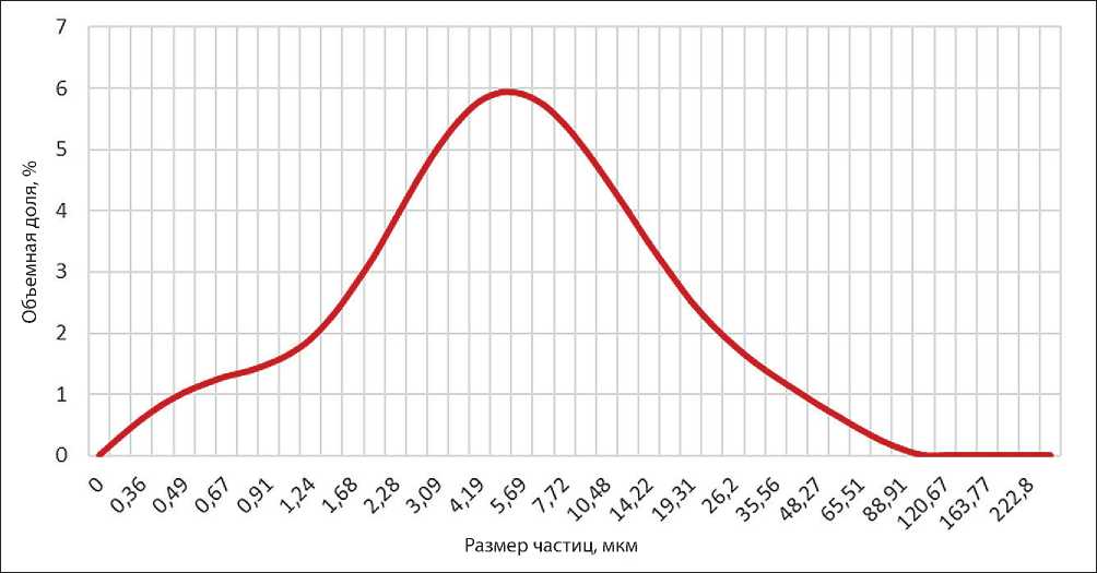 Оценка гранулометрического состава добавки в виде 2% раствора методом лазерной дифракции на анализаторе размеров частиц Shimadzu SALD-7500 показала, что гранулометрический состав отличается полимодальным характером распределения в интервале от 100 до 1000 нм, максимум пика приходится на 300 нм (рис. 1). Очевидно, что в данном случае учитывается размер не дисперсных частиц, а их агрегатов. Использование добавки в виде 2% раствора в количестве 0,4% от массы цемента при водоцементном отношении В/Ц = 0,26 для получения цементного теста нормальной густоты привело к снижению размера частиц в 2,5–3 раза. Чем больше обводнены коллоидные частицы в виде мицелл, тем меньше в них примесей исходных соединений, тем меньше размер и выше дисперсность соединений. Образуемые частицы коллоидного раствора имеют высокий уровень поверхностной энергии и служат центрами кристаллизации вяжущих веществ [17].