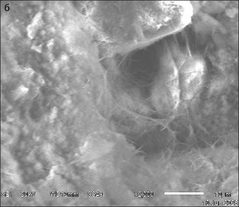 Рис. 6. Растровая электронная микроскопия самоуплотняющегося бетона: а – контрольный состав, б – состав с УДД