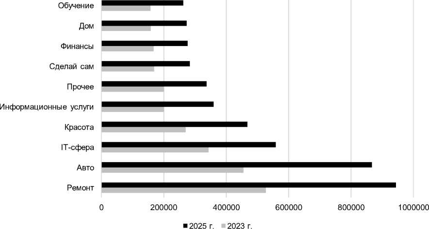 Анализ данных о количественном распределении самозанятых по отраслевой принадлежности за апрель 2023 г. и 2025 г., полученных с платформы поставки данных ФНС России, позволяет выявить следующие тенденции (рис. 2).