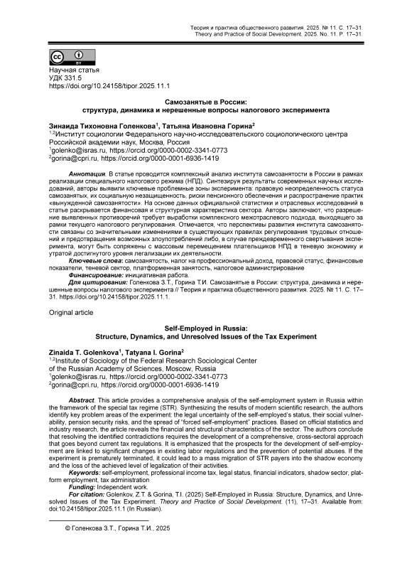 В статье проводится комплексный анализ института самозанятости в России в рамках реализации специального налогового режима (НПД). Синтезируя результаты современных научных исследований, авторы выявили ключевые проблемные зоны эксперимента: правовую неопределенность статуса самозанятых, их социальную незащищенность, риски пенсионного обеспечения и распространение практик «вынужденной самозанятости». На основе данных официальной статистики и отраслевых исследований в статье раскрывается финансовая и структурная характеристика сектора. Авторы заключают, что разрешение выявленных противоречий требует выработки комплексного межотраслевого подхода, выходящего за рамки текущего налогового регулирования. Отмечается, что перспективы развития института самозанятости связаны со значительными изменениями в существующих правилах регулирования трудовых отношений и предотвращения возможных злоупотреблений либо, в случае преждевременного свертывания эксперимента, могут быть сопряжены с массовым перемещением плательщиков НПД в теневую экономику и утратой достигнутого уровня легализации их деятельности.