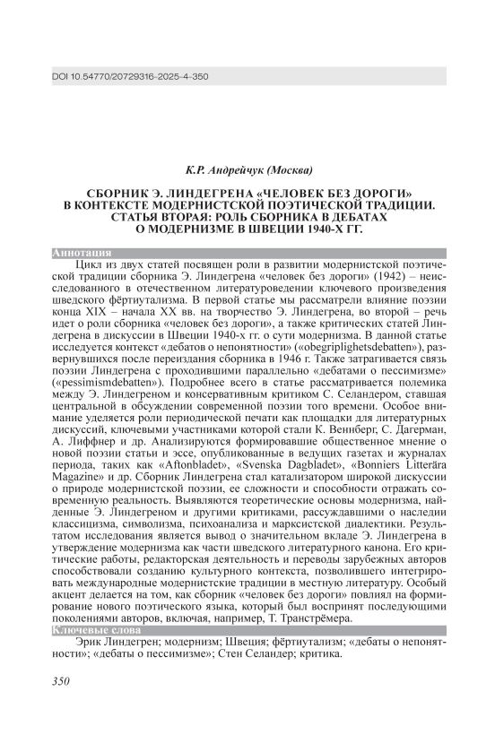 Цикл из двух статей посвящен роли в развитии модернистской поэтической традиции сборника Э. Линдегрена «человек без дороги» (1942) – неисследованного в отечественном литературоведении ключевого произведения шведского фёртиутализма. В первой статье мы рассматрели влияние поэзии конца XIX – начала ХX вв. на творчество Э. Линдегрена, во второй – речь идет о роли сборника «человек без дороги», а также критических статей Линдегрена в дискуссии в Швеции 1940-х гг. о сути модернизма. В данной статье исследуется контекст «дебатов о непонятности» («obegriplighetsdebatten»), развернувшихся после переиздания сборника в 1946 г. Также затрагивается связь поэзии Линдегрена с проходившими параллельно «дебатами о пессимизме» («pessimismdebatten»). Подробнее всего в статье рассматривается полемика между Э. Линдегреном и консервативным критиком С. Селандером, ставшая центральной в обсуждении современной поэзии того времени. Особое внимание уделяется роли периодической печати как площадки для литературных дискуссий, ключевыми участниками которой стали К. Веннберг, С. Дагерман, А. Лиффнер и др. Анализируются формировавшие общественное мнение о новой поэзии статьи и эссе, опубликованные в ведущих газетах и журналах периода, таких как «Aftonbladet», «Svenska Dagbladet», «Bonniers Litterära Magazine» и др. Сборник Линдегрена стал катализатором широкой дискуссии о природе модернистской поэзии, ее сложности и способности отражать современную реальность. Выявляются теоретические основы модернизма, найденные Э. Линдегреном и другими критиками, рассуждавшими о наследии классицизма, символизма, психоанализа и марксистской диалектики. Результатом исследования является вывод о значительном вкладе Э. Линдегрена в утверждение модернизма как части шведского литературного канона. Его критические работы, редакторская деятельность и переводы зарубежных авторов способствовали созданию культурного контекста, позволившего интегрировать международные модернистские традиции в местную литературу. Особый акцент делается на том, как сборник «человек без дороги» повлиял на формирование нового поэтического языка, который был воспринят последующими поколениями авторов, включая, например, Т. Транстрёмера.