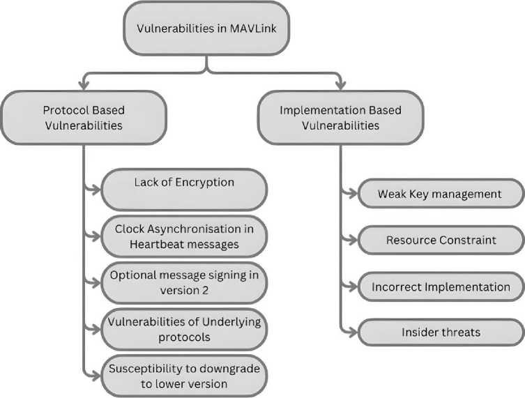 In the case of MAVLink, some vulnerabilities stem from its design choices, such as the lack of built-in encryption in MAVLink v1, making it susceptible to message interception and spoofing. Other vulnerabilities arise from the way MAVLink is integrated into drone systems, such as improper key management or insecure wireless transmission methods. To systematically analyse these risks, we classify MAVLink vulnerabilities into two categories as shown in Fig.4: protocol-based vulnerabilities, which originate from the MAVLink specification itself, and implementation-based vulner- abilities, which result from how MAVLink is deployed in real-world UAV systems. By examining each category in detail, we aim to uncover the security gaps in MAVLink communication and propose effective countermeasures to enhance UAV security.