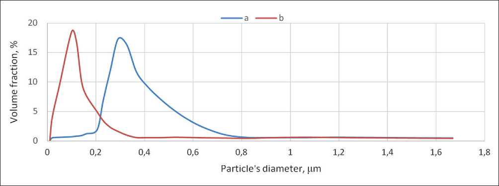 Fig. 1. Analysis of dispersion of the initial 2% solution of the additive (a) and the additive diluted with mixing water when introduced into the cement (b)
