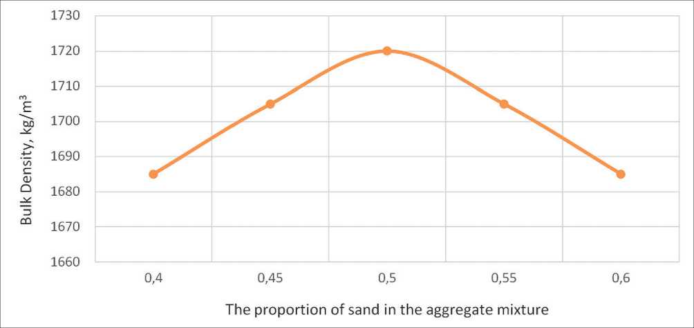 Fig. 3. Dependence of the bulk density of the aggregate mixture on the proportion of sand in the mixture