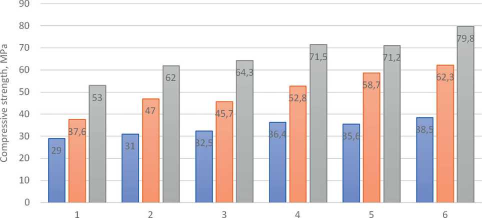 The physical and mechanical properties of selfcompacting concrete were determined for the developed compositions. The compressive strength of the control samples after 28 days of normal curing (Fig. 5) corresponds to the design class for all concrete compositions under consideration. The introduction of UFA increases the compressive strength of concrete by 27% compared to the control composition at the age of up to 7 days of hardening and by 17% at the design age.