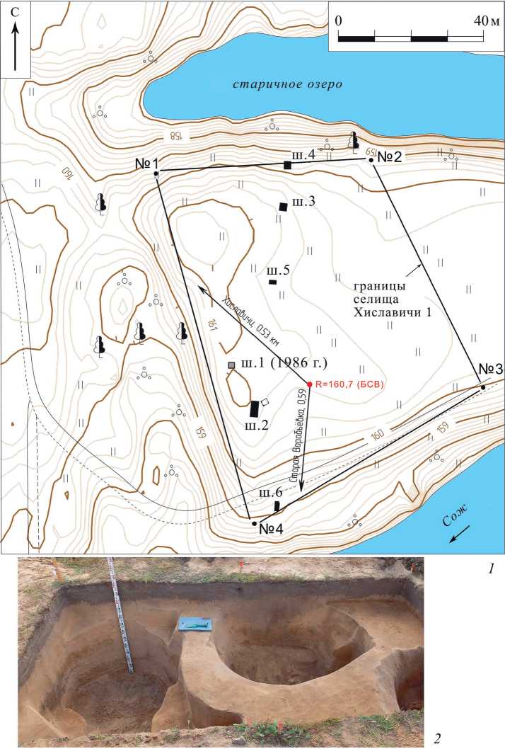 Для изучения культурного слоя селища Хиславичи 1 был заложен трансект из пяти шурфов (рис. 1: 1 ), пересекший его территорию с юга на север – от бровки берега современного русла Сожа до бровки берега старичного озера. В трансекте было пять шурфов (№ 2–6, первый номер остался за шурфом 1986 г.) общей площадью 20 кв. м.