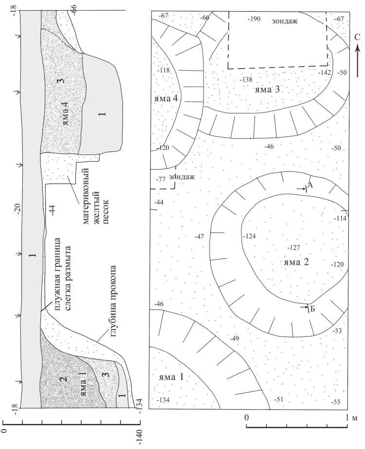 1 – темно-серый песок; 2 – светлый серо-бурый песок; 3 – желто-бурый песок. А-Б – профиль ямы