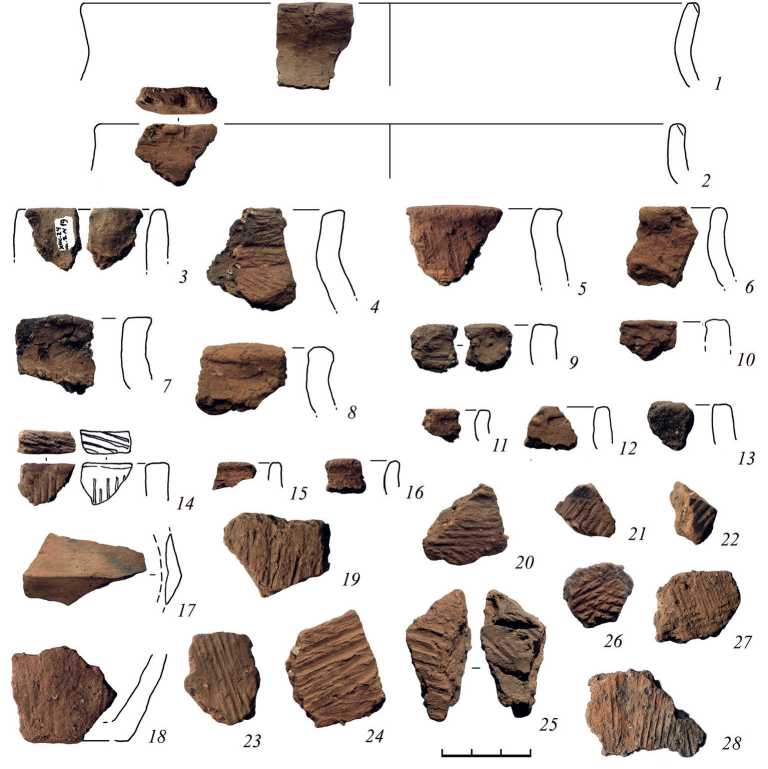 Наиболее очевидно деление керамики на три группы. Первая из них (преобладающая) – довольно толстостенная грубая керамика с примесью крупной дресвы. Венчики чаще всего близки к вертикальному положению (рис. 3: 3, 9–16 ; 4: 2, 7, 9 ; 5: 2, 4, 8 ) и указывают на слабую профилированность форм. Некоторые происходят от сосудов с сужающейся верхней частью и слегка отогнутым краем (рис. 3: 1, 4–8 ; 4: 4 ; 5: 1, 3 ). Часть сосудов имела перегиб тулова в виде ребра (рис. 4: 8, 10 ). Большинство фрагментов очень мелкие для суждений о типологии форм, но, наиболее вероятно, – это типы 1, 2, 7 и Р-1.