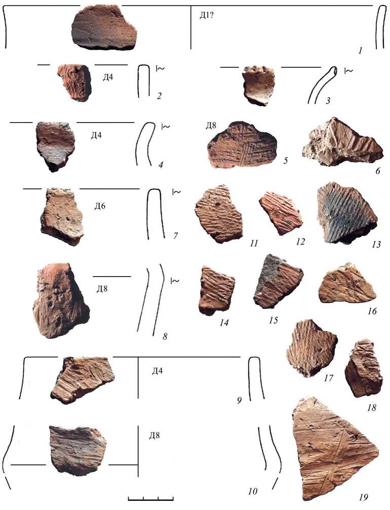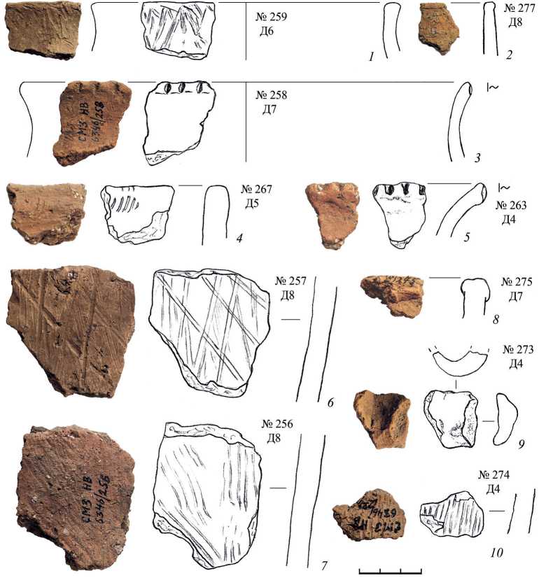 Многие фрагменты снаружи покрыты «бороздчатым заглаживанием» (по А. А. Бобринскому), т. е. штриховкой или расчесами (рис. 3: 4, 5, 14, 19–27 ; 4: 5, 6, 8–19 ; 5: 1, 4, 6, 7, 10 ). Трудно судить о предметах, которыми делался этот декор, но обычно предполагаются зазубренные щепки, обломки гребней, солома. Изредка присутствуют орнаментальные композиции – перекрещивания линий и полос (рис. 3: 20, 26, 27 ; 4: 5–7 ). Встречаются расчесы по верхнему уплощенному краю сосуда (рис. 3: 14 ). В целом все экземпляры декора более хаотичны и грубы, чем на памятниках типа Заозерье, например, из недавних публикаций, на селище Силуяново ( Кренке и др ., в печати).