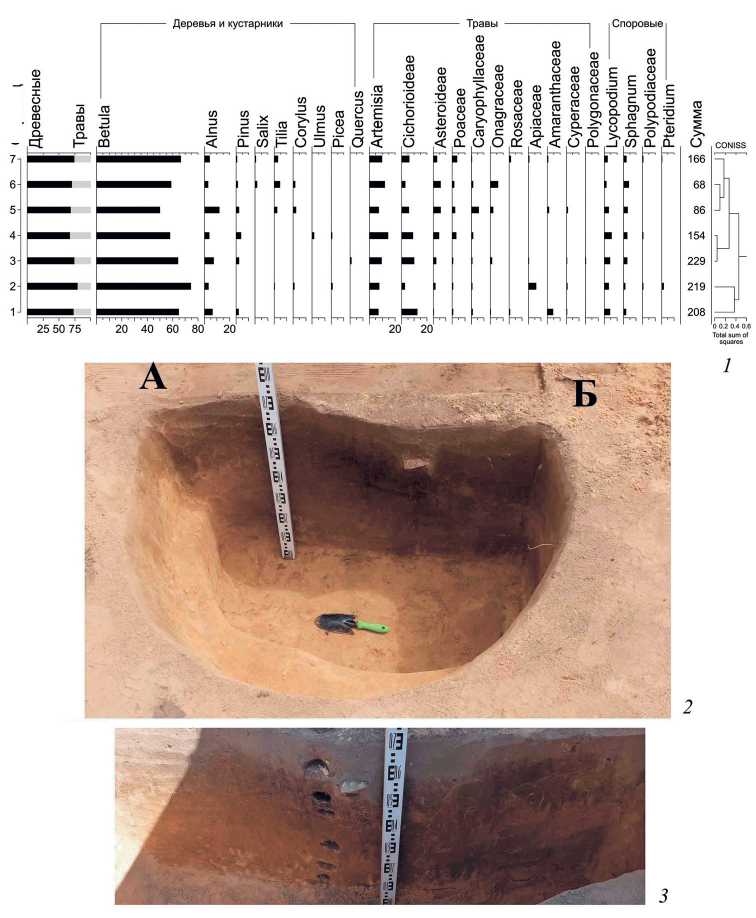 Рис. 6. Хиславичи, селище. Спорово-пыльцевая диаграмма заполнения ямы 2 (1) и место отбора образцов – профиль АБ заполнения ямы 2 (2), обозначенный на рис. 2; схема отбора образцов (3), вид с запада маревые (Amaranthaceae), однако их суммарная доля не превышает 5–7 %. Среди споровых преобладают плауны (Lycopodium) и сфагновые мхи (Sphagnum). Однородность состава свидетельствует, что все спектры образованы в одно время, по-видимому, единомоментно при заполнении ямы. Они отражают преобразование растительного покрова во время жизни поселения – преобладание пыльцы березы свидетельствует о распространении вторичных лесов вокруг памятника, тогда как высокая доля пыльцы рудеральных растений указывает на большую площадь нарушенных местообитаний, таких как обочины дорог. Это свидетельствует о коренных изменениях растительности и ландшафта. Отсутствие пыльцы культурных злаков и других индикаторов земледелия указывает, что в непосредственной близости от изученной ямы не было пашен и сельскохозяйственных угодий.