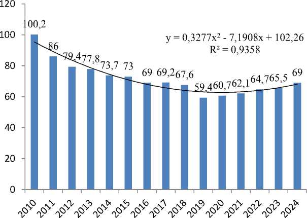 В ходе исследования выявлено два цикла изменения данного показателя: первый (по продолжительности он соответствует циклам Жуглара) 2010-2019 гг., который характеризуется относительно устойчивым сокращением численности работников; второй период (по продолжительности соответствует циклам Китчина) 2020-2024 гг., в котором отмечается ежегодный рост численности работников, занятых в сельском хозяйстве.